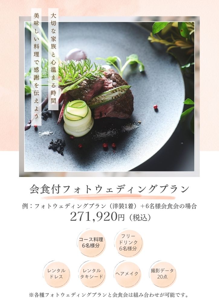 会食付フォトウェディングとは、写真撮影の後にご家族やお二人での会食会を組み合わせるスタイルです。